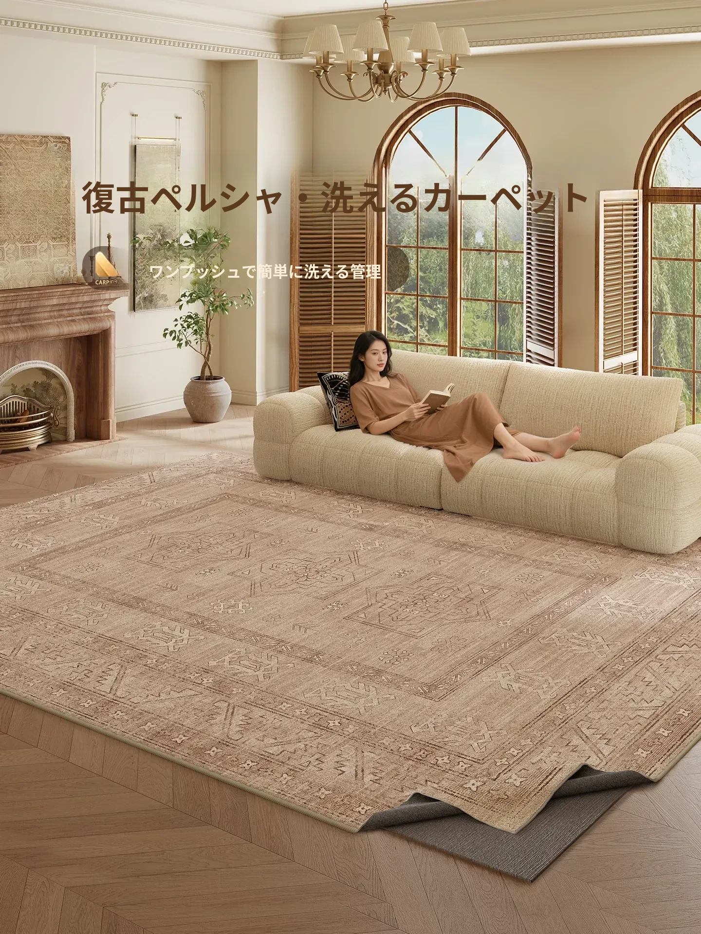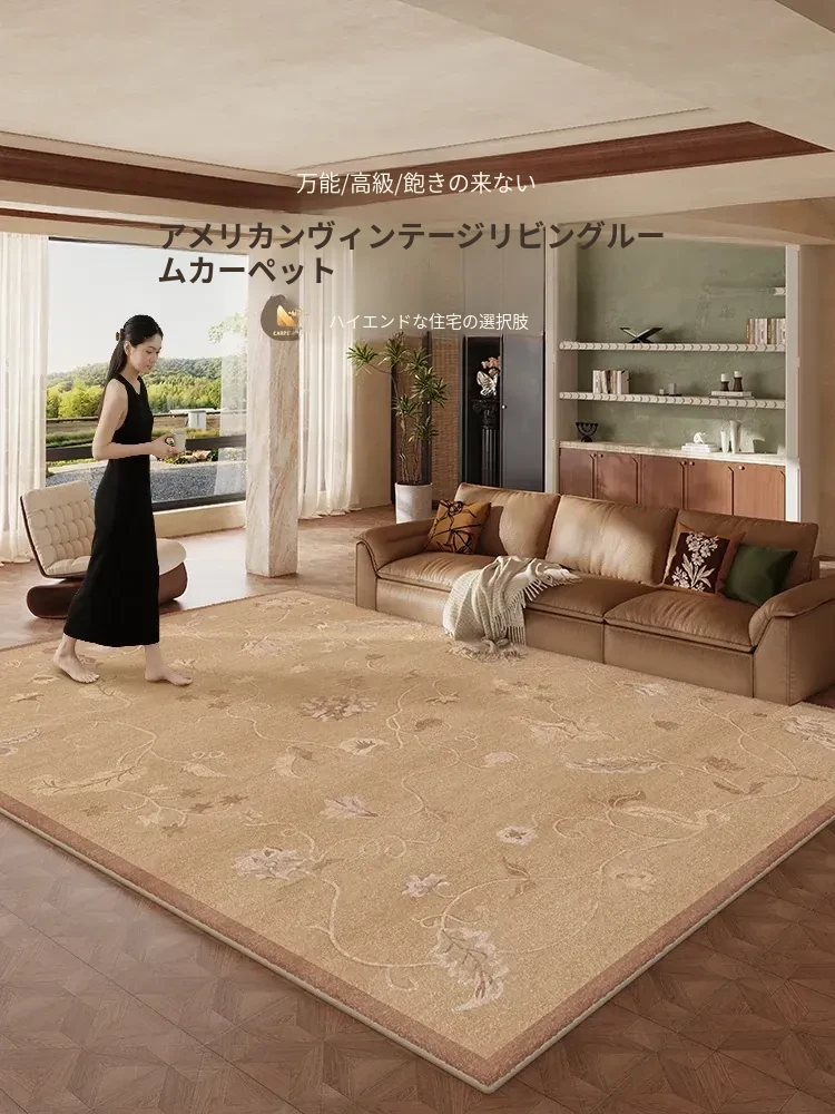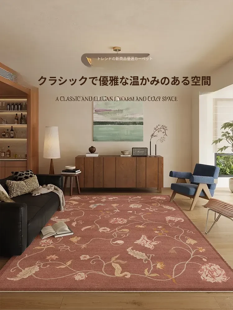 2026年新作!フレンチヴィンテージスタイルのリビングルームカーペット。ベッドサイドにも最適な大面積全敷きタイプ。お手入れ簡単なウォッシャブルデザインで、ティーセットを置くのにぴったりな一枚です。